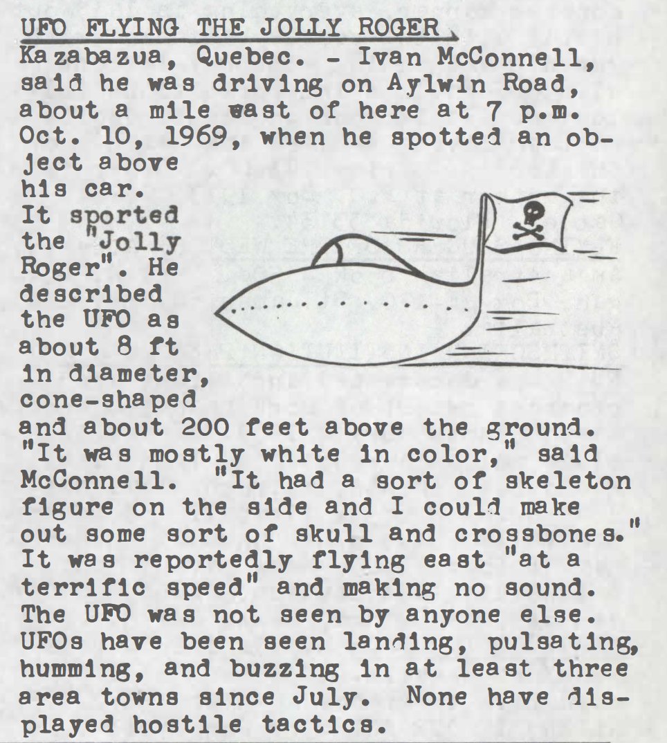 Kazabazua, Quebec. Ivan McConnell dijo que conducía por Aylwin Road, aproximadamente a una milla al oste de Kazabazua, Quebec, a las 7 p. m. del 10 de octubre de 1969, cuando vio un objeto sobre su auto. Lucía la “Bandera Pirata”. Describió el OVNI como de unos 2.4 metros de diámetro, con forma de cono y a unos 60 metros del suelo. “Era principalmente de color blanco”, dijo McConnell. “Tenía una especie de figura esquelética en el costado y pude distinguir una especie de calavera y huesos cruzados”. Se informó que volaba hacia el este “a una velocidad tremenda” y no hacía ningún ruido. El OVNI no fue visto por nadie más. Se han visto OVNIs aterrizando, pulsando, vibrando y zumbando en al menos tres pueblos de la zona desde julio. Ninguno ha mostrado tácticas hostiles.