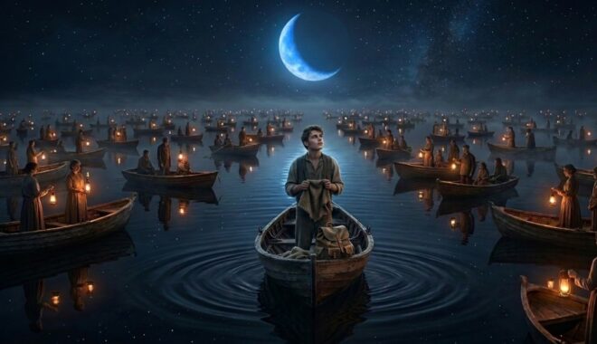 En ese momento se quitó la venda de los ojos. La escena que se presentó ante él era surrealista. La lancha comenzó a emerger debajo de él sin hacer ruido; el ambiente tenía un silencio abrumador, el mar parecía un espejo donde reflejaban las estrellas y una extraña luna de color azul se veía en la bóveda celeste. Miles de barcas con personas en ellas flotaban a su alrededor; algunas con pequeñas lámparas como las antiguas de petróleo iluminaban tenuemente ese ambiente que se podría describir entre tétrico y cautivante. Entonces Guillermo se dio cuenta de que estaba en el mundo de los muertos.