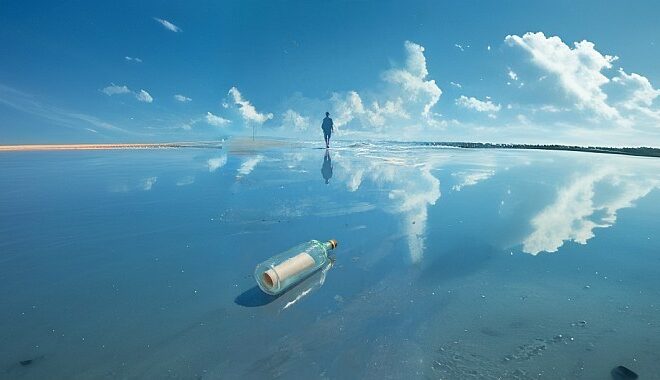 “Era un día perfecto para reflexionar sobre su vida” se decía a sí mismo, mientras caminaba observando el horizonte como buscando una respuesta a sus preocupaciones, cuando de pronto tropezó con una extraña botella que no parecía nada convencional, de un tono esmeralda verdoso y un extraño tapón de corcho, la botella reflejaba la luz del sol de una manera peculiar, inmediatamente le llamó la atención, ya que dentro de ella había un extraño objeto. Por instinto recogió la botella y la limpió con la mano, revelando un papel amarillento enrollado dentro de ella.